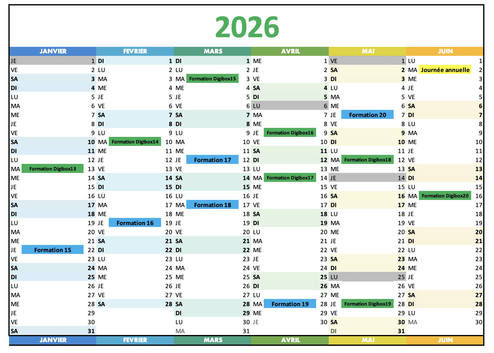 Calendrier : les dates des formations de formateurs et des présentations des Digibox.